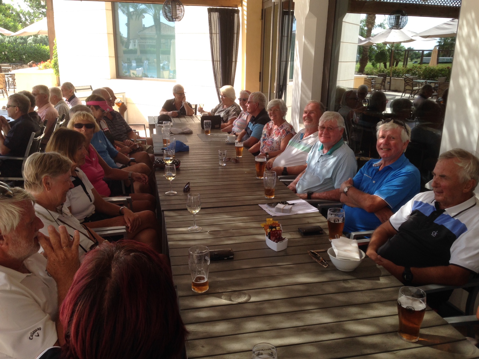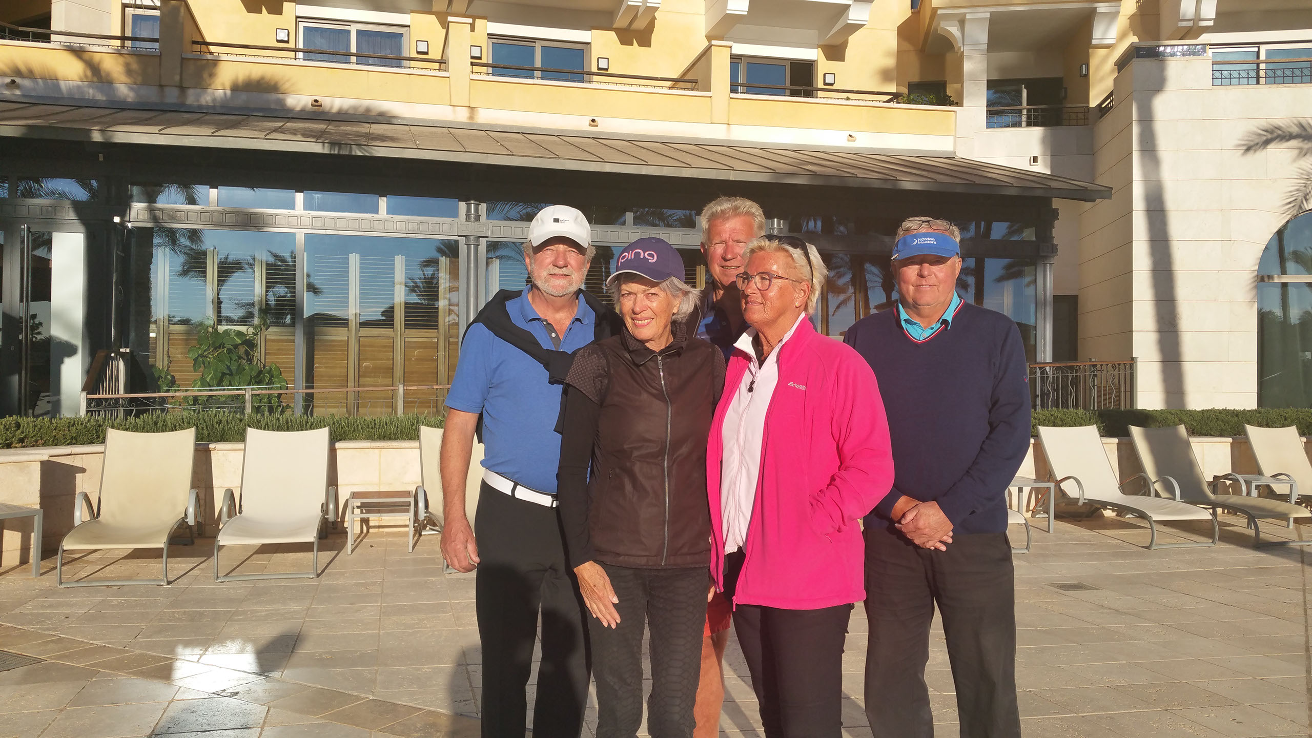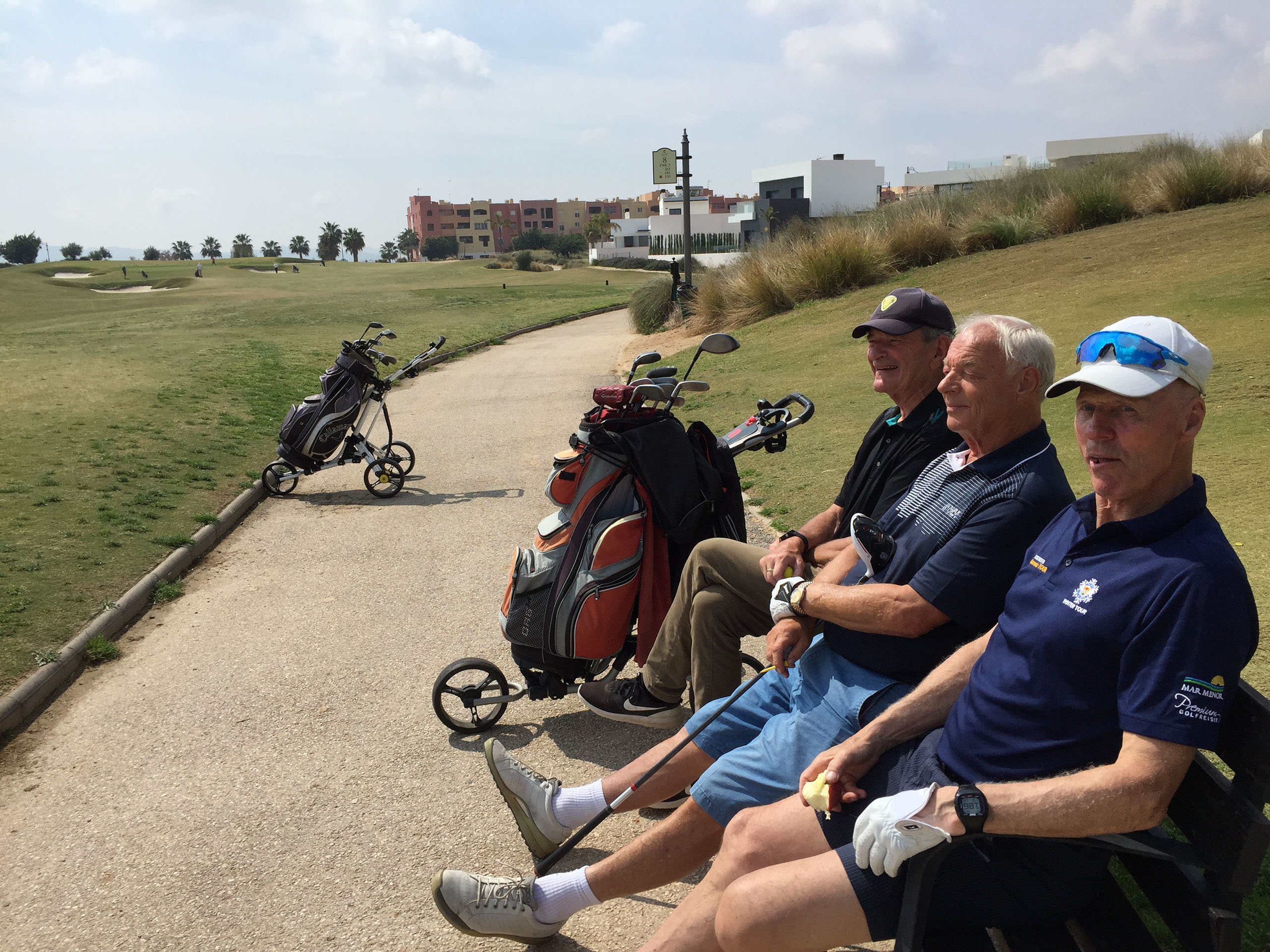 Opp mot 230 år benket på hull 8. Helse i hvert slag. Fra venstre: Pelle, Johan- Ludvik og Erik Just-Olsen. Tar vi med fotografen har vi 300 år i flighten. Foto: Geir Engelsen.